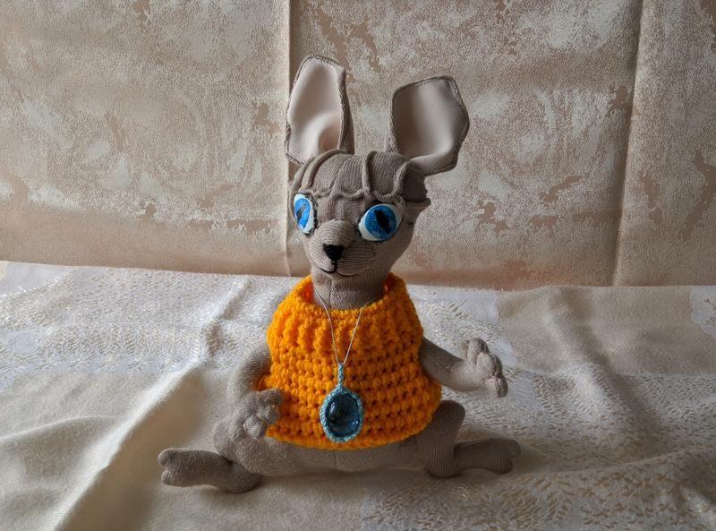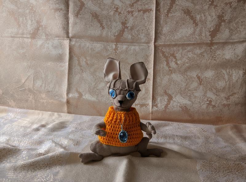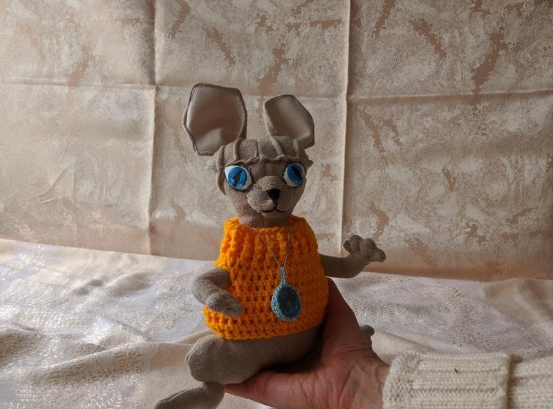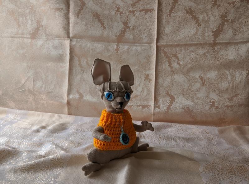 Уникальная авторская игрушка кот сфинкс по имени Марс выполнена с большой любовью из качественных материалов. Каждая деталь тщательно продумана. Основной материал - полушерсть, наполнитель – гипоаллергенный (синтепух), жилет связан из пряжи Alize Baby Best акрил. Сфинкс очень мягкий, приятный на ощупь, что делает его еще более привлекательным. Глаза нарисованы вручную акриловыми красками и покрыты лаком. Марс - это идеальный друг для ваших детей или для взрослых, которые любят этих загадочных и уникальных котов. Кот Марс - это символ нежности и любви, который станет прекрасным подарком для ваших близких и друзей, или просто украсит вашу комнату.
