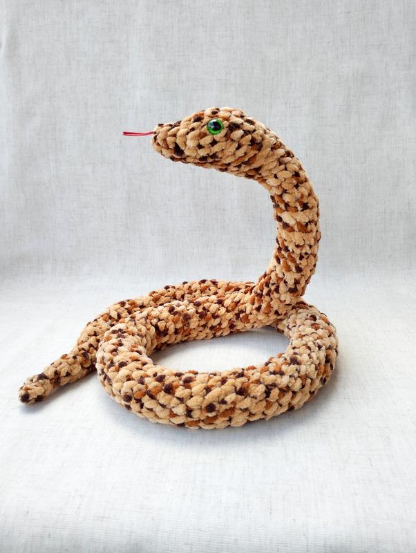 Змея, вязаная крючком, пряжа плюш, наполнитель холлофайбер, всредние проволоки, что позволяет выгнетать змею в любое положение, глаза на безопасном креплении, длина 105 см, обхват 11 см