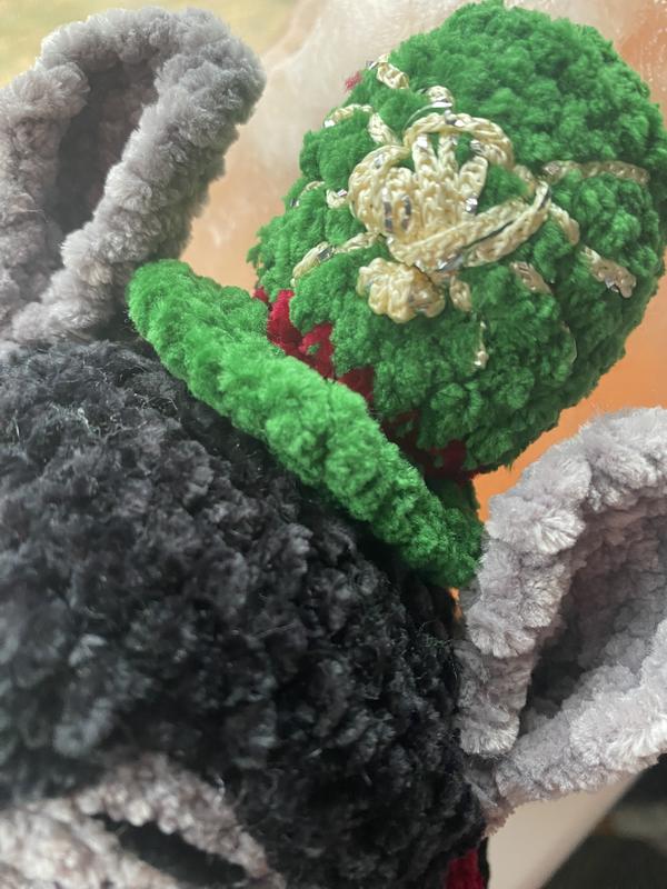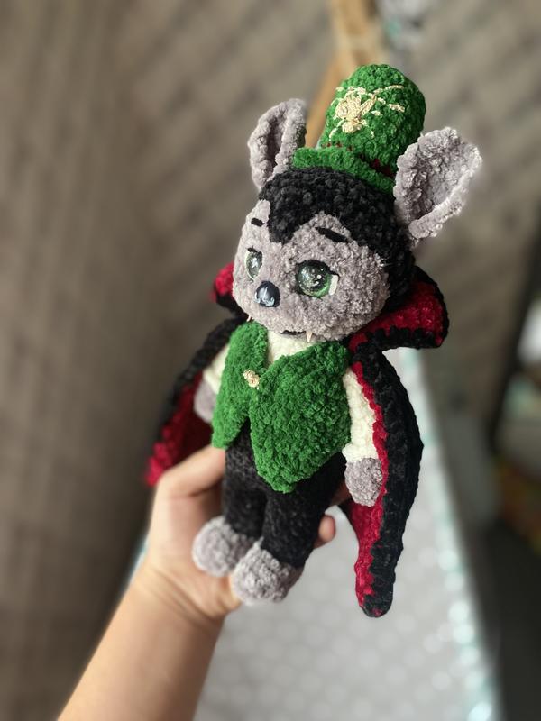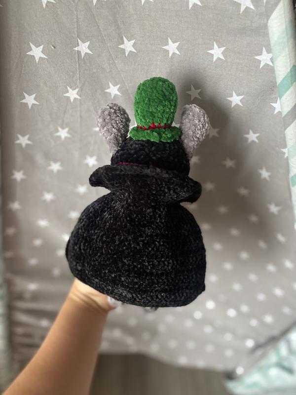 игрушка выполнена из плюшевой пряжи, наполнения -холофайбер, глаза на безопасном креплении, шляпа и плащ пришиты, высота -27 см с учетом шляпы.