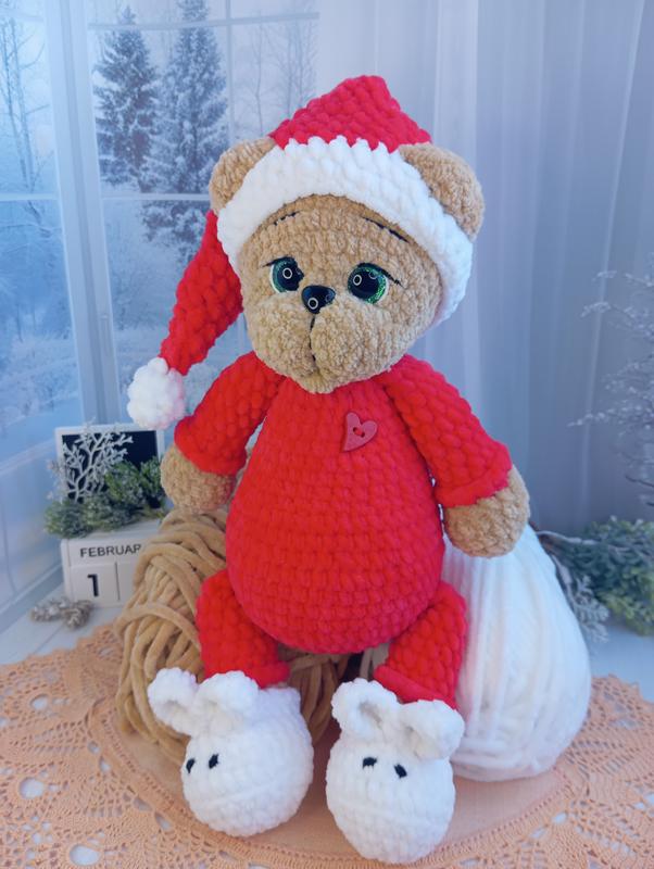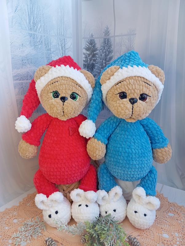 Игрушка мишка в пижаме связана крючком из плюшевой гипоаллергенной пряжи, наполнитель холлофайбер, надежное крепление деталей. Высота 31 см. Очень нежный на ощупь.