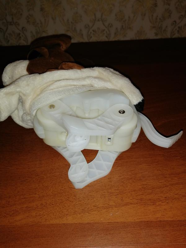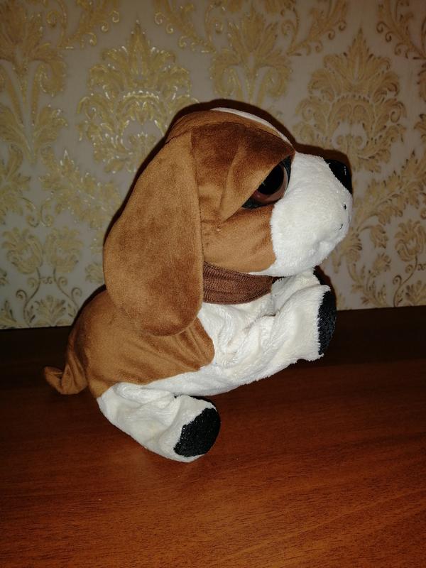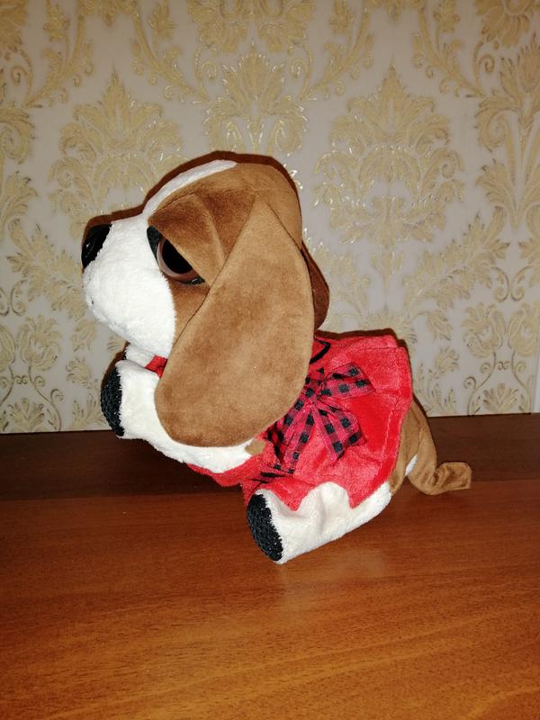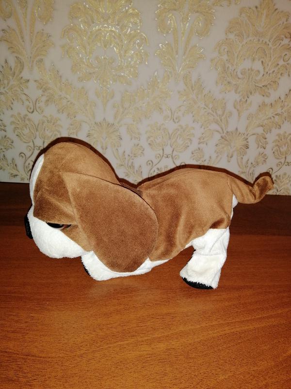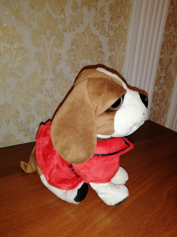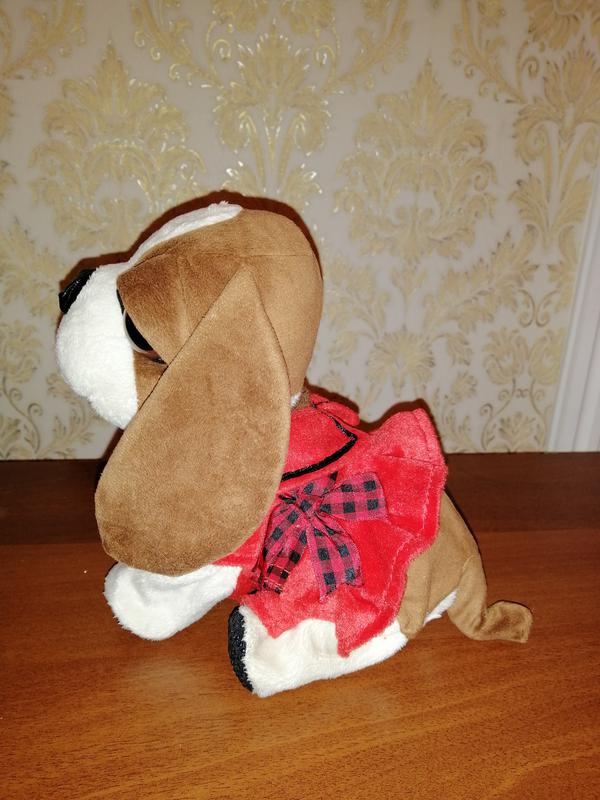 Собачка на 4-х батарейках, движется, принимает несколько поз. Отдельно можно одеть комбинезон. Также можно ее почистить, сняв верх собачки. Батарейки тоже легко заменить. Размер 35 Х 23 см