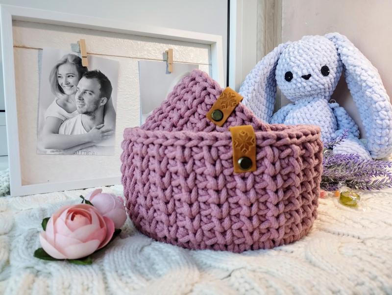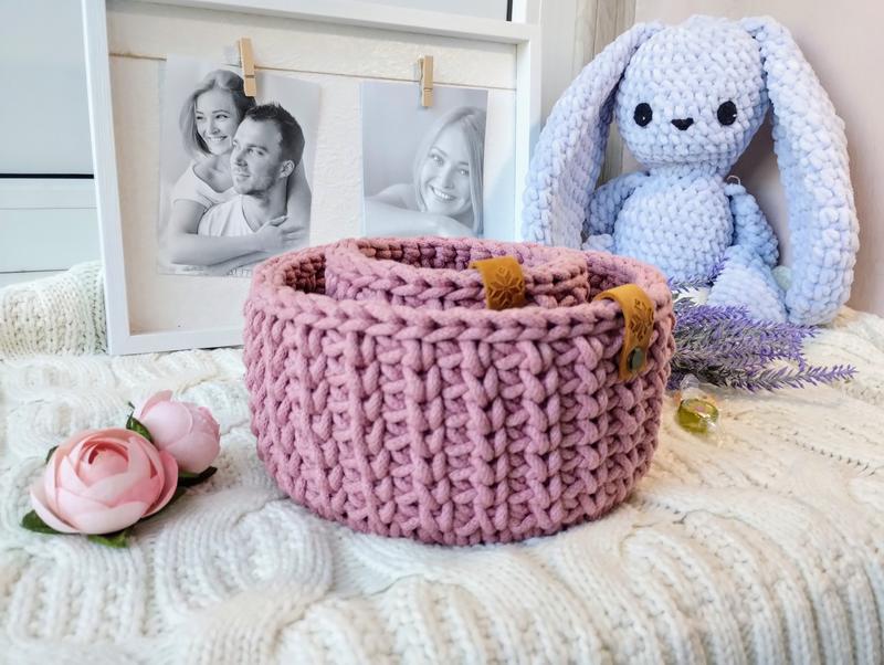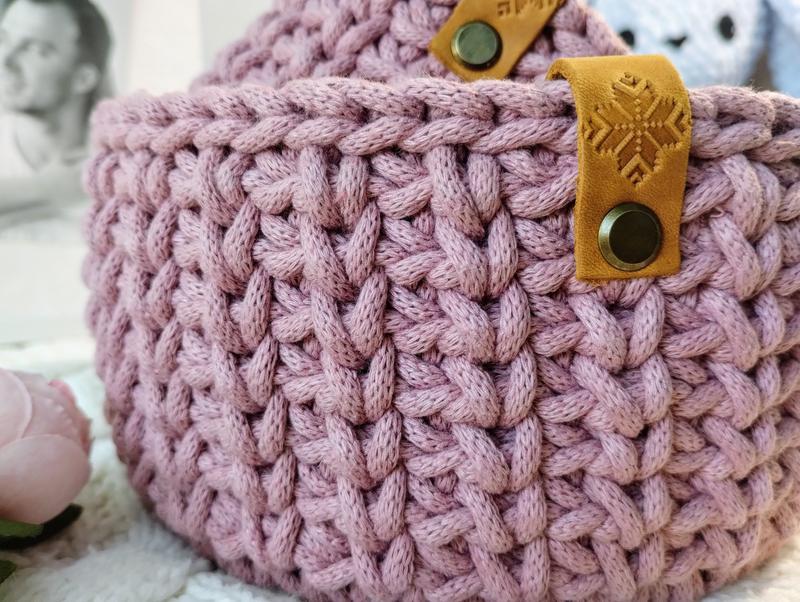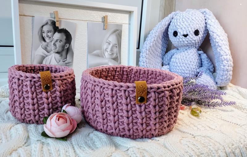 Этот очаровательный комплект содержит две вязаные корзинки, изготовленные из хлопкового шнура. Их розовый цвет придает им нежный и элегантный вид, создавая теплую и уютную атмосферу в любом помещении. Дополнительно украшены кожаной биркой с украинской символикой.