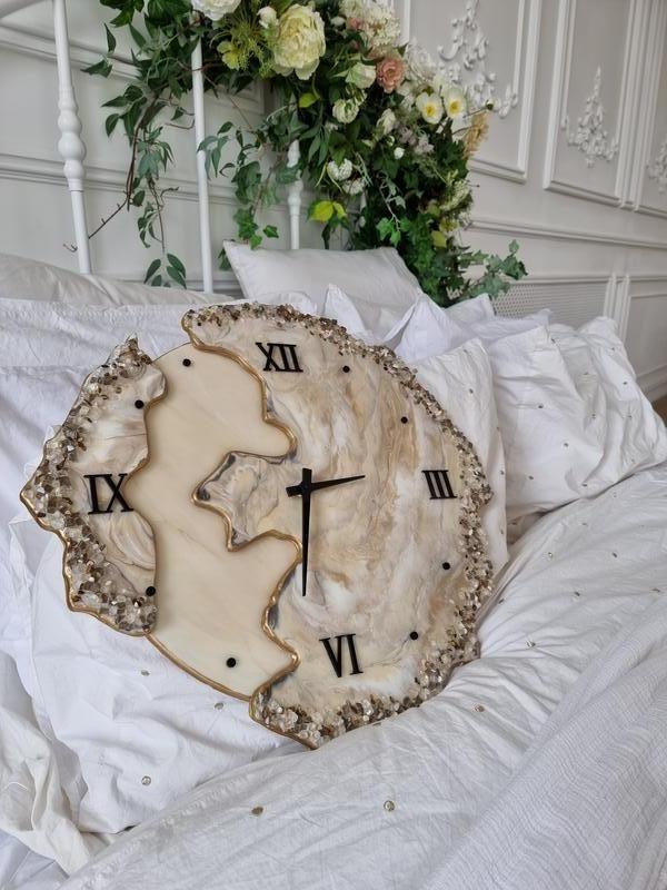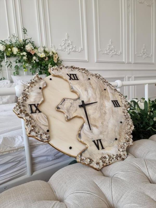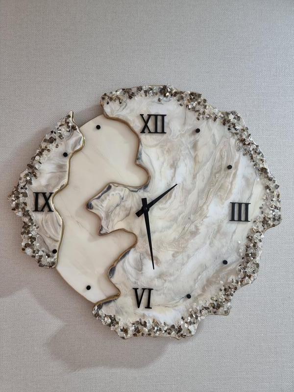 Дизайнерские часы ручной работы,оригинальная форма.Основа часов мдф,эпоксидная смола,инкрустированы декоративной крошкой. Стрелки и цифры выпронены из акрила,механизм с тихим ходом.Размер часов 51×48 см.Возможно изготовление подобных часов в любом размере и оттенке.