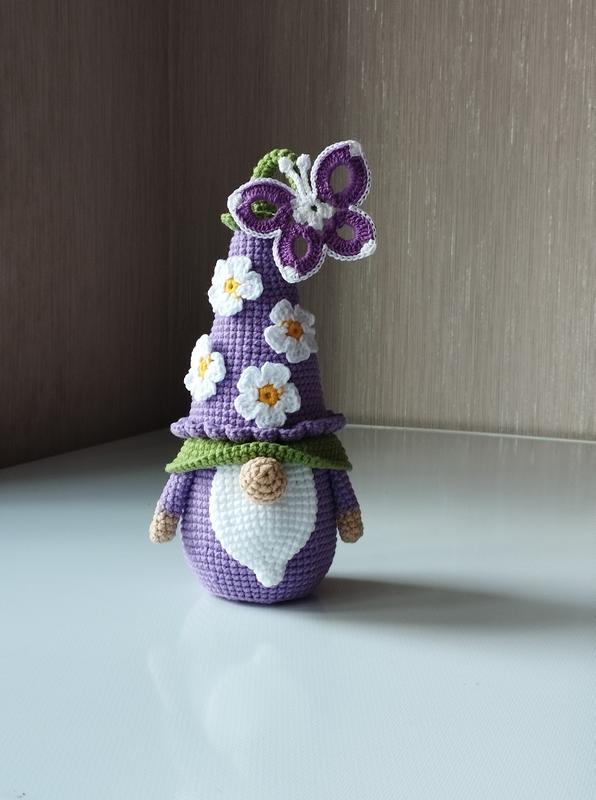 гном вязаный крючком (pronounce made). Высота 25 см, наполнитель-холлофайбер. Стоит самостоятельно.
