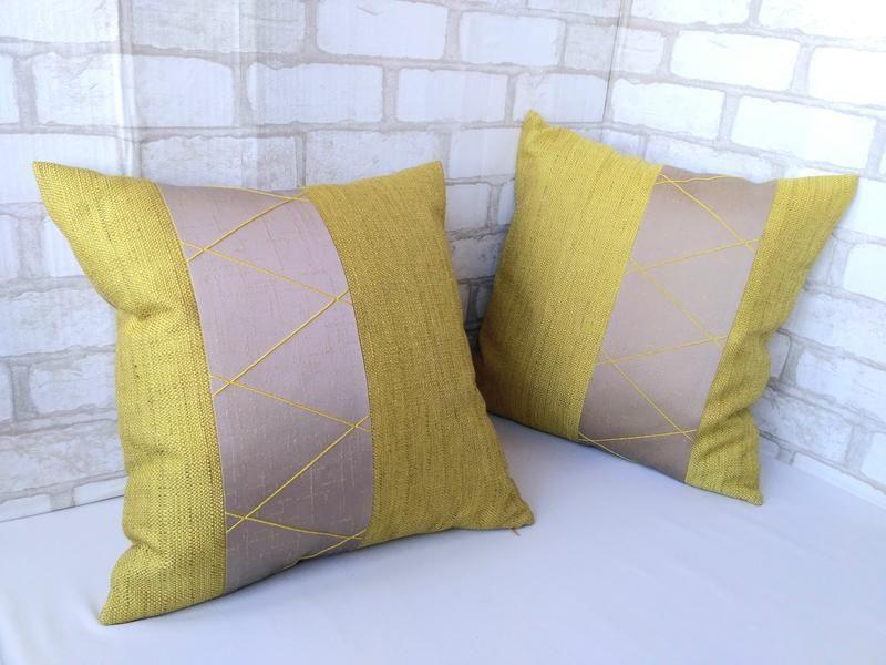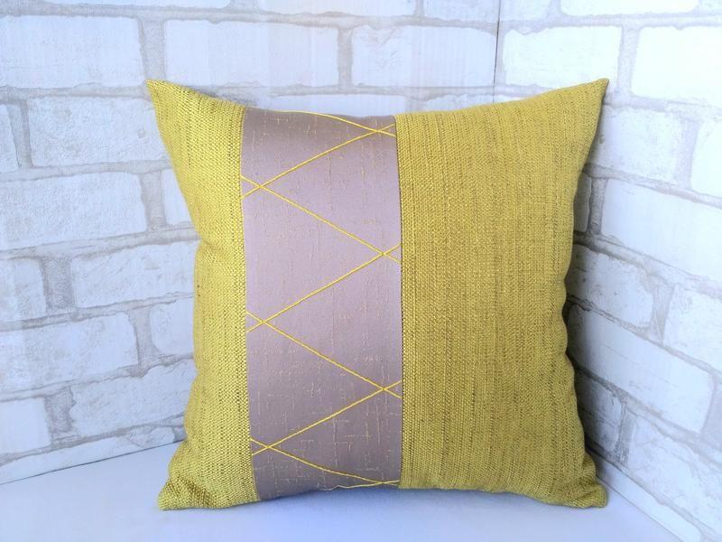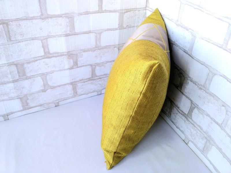 Подушка односторонняя (передняя и задняя часть выполнены одинаково). Плотная роговожка желто-горчичного цвета и полиэстер средней плотности серого цвета с декоративным желтым узором "полоски-ромбы".