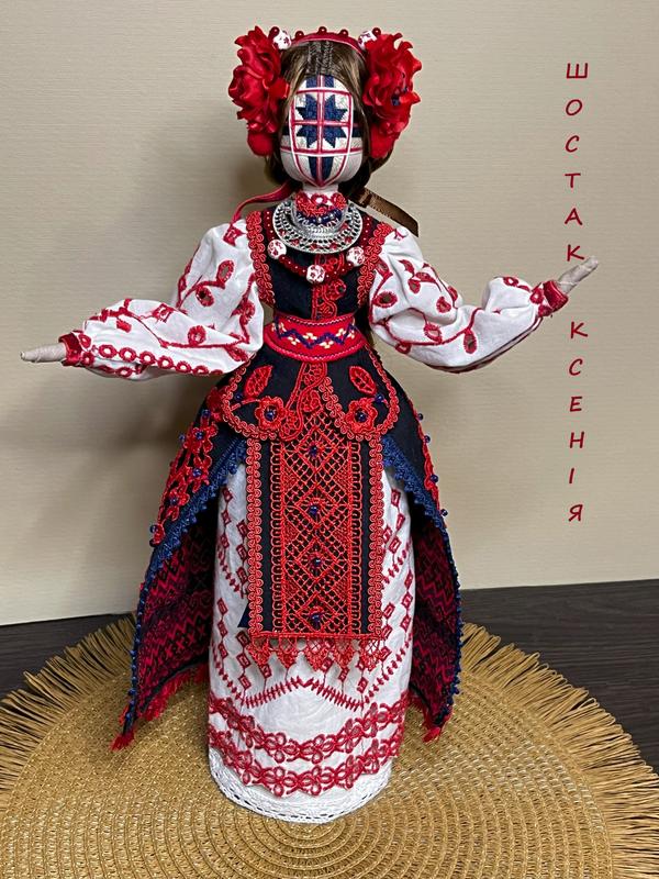Святкова лялечка в яскравих контрастних кольорах. Леди на деревянной подставке, ручки гибкие, наряды из натуральных тканей. Имеет на смену две фартуки. В двухслойной плахте есть подклад с геометрическим орнаментом. Снаружи украшена симметричными цветочными узорами, выложенными из отдельных фрагментов кружева, которые повторяются и на керсетке. В дополнение образу яркий венчик и роскошные ожерелья.