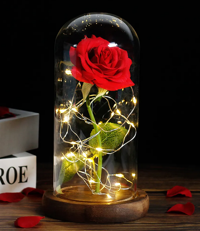 Роза из одноименного фильма и сериала "Красавица и Чудовище". Внутри колбы светодиоды, которые можно разместить по всей колбе. Питается от батареек.