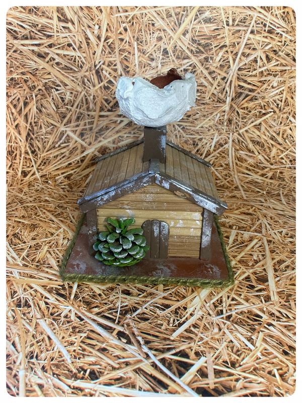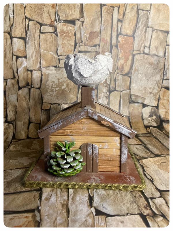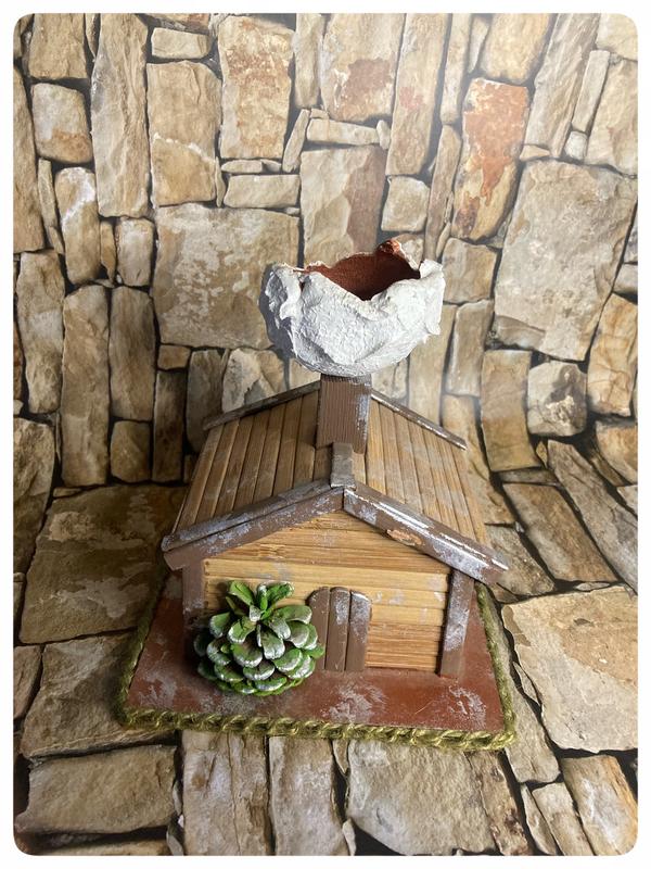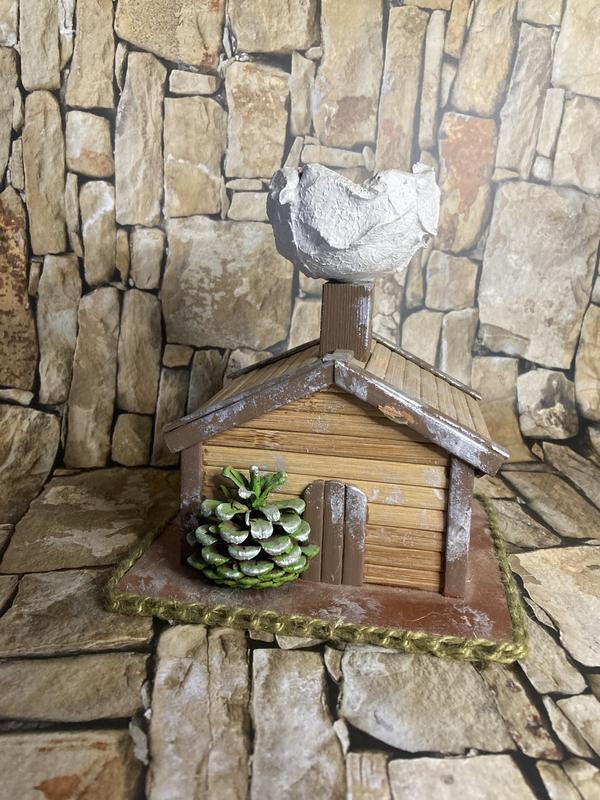 Деревянный домик дополнен красивым гипсовым подсвечником. Такой домик красиво дополнит ваш интерьер и будет радовать вас.