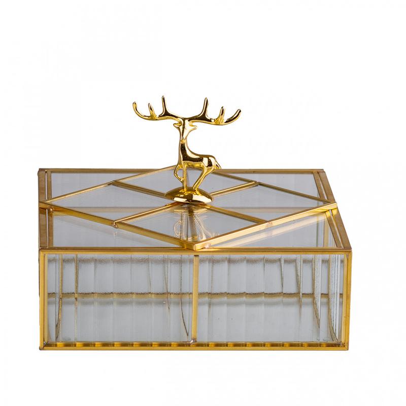 Шкатулка для прикрас золотий олень квадратна скло з металевим каркасом 22х22 см