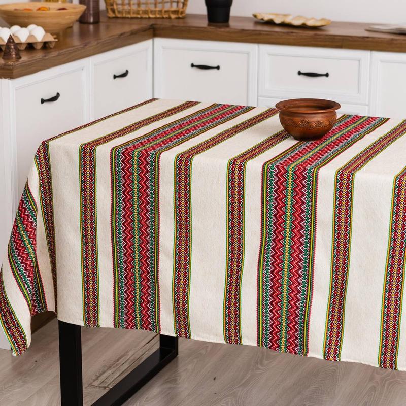 Скатерть - незаменимый элемент декора кухни или столовой. Скатерть в украинском стиле – семейный предохраняет. Традиционный украинский орнамент на скатере сделает интерьер тематическим. Ткань с эффектом объемной вышивки и фактурой натурального льна.