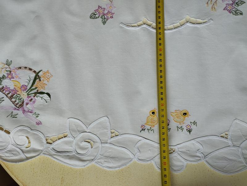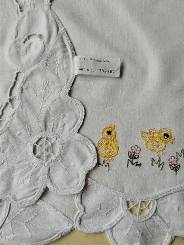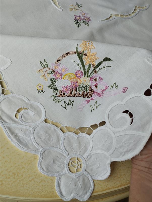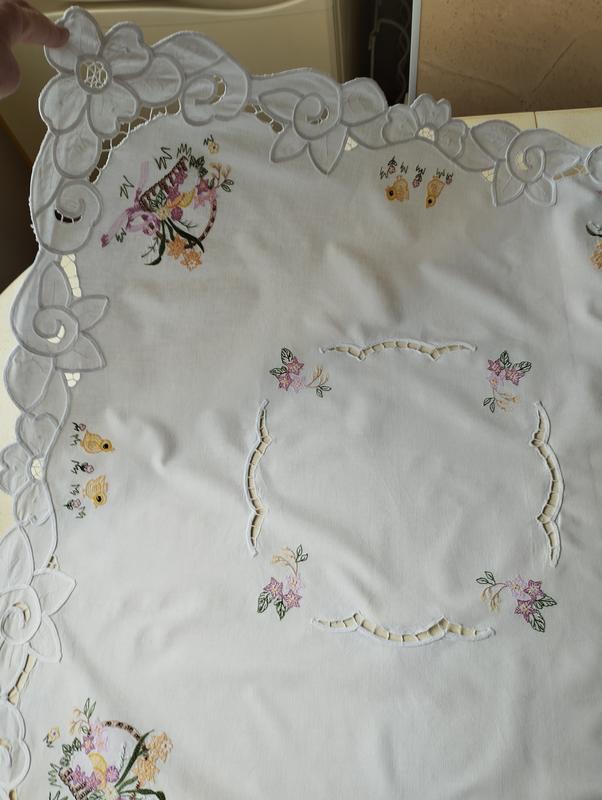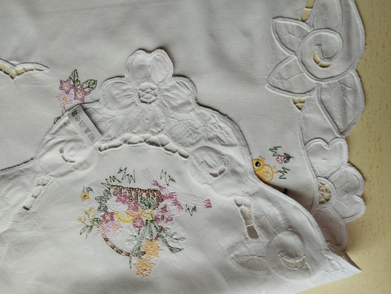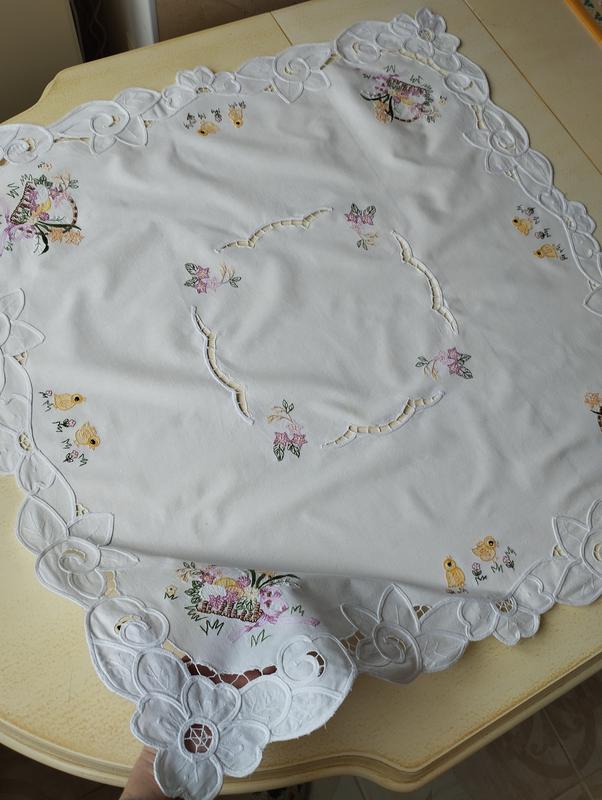 Белоснежная гаптированая скатерть с вышитыми крупнокодельными корзинами с весенними цветами и милыми цыпленками😍🐥🐣🌺🤍