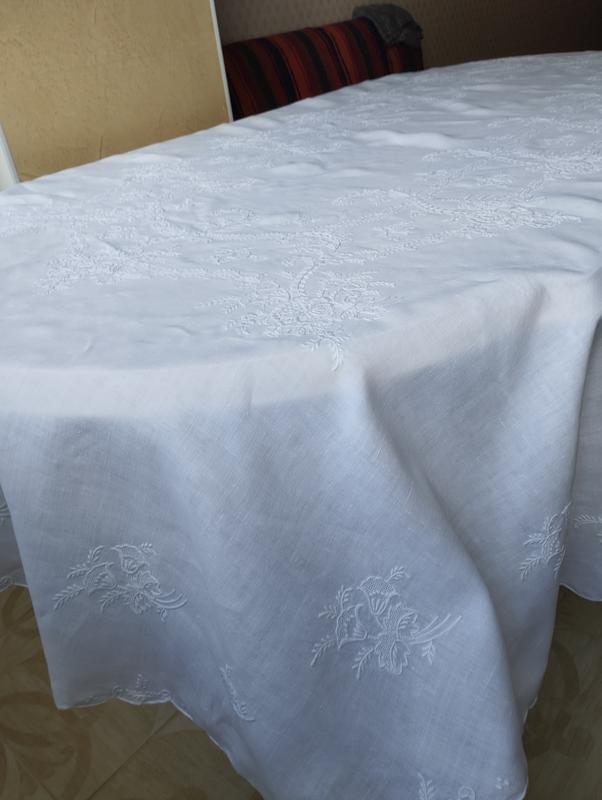 Невероятная эксклюзивная льняная скатерть на большой стол, размер 168х254🤩👌👍, отличная, богатая плотная белая вышивка и по центру, и по фигурному краю, очень качественная и неповторимая, такая будет только у Вас🤩😍👌👍🤍💮