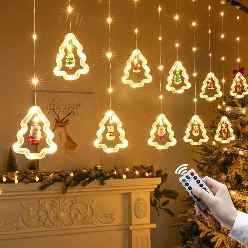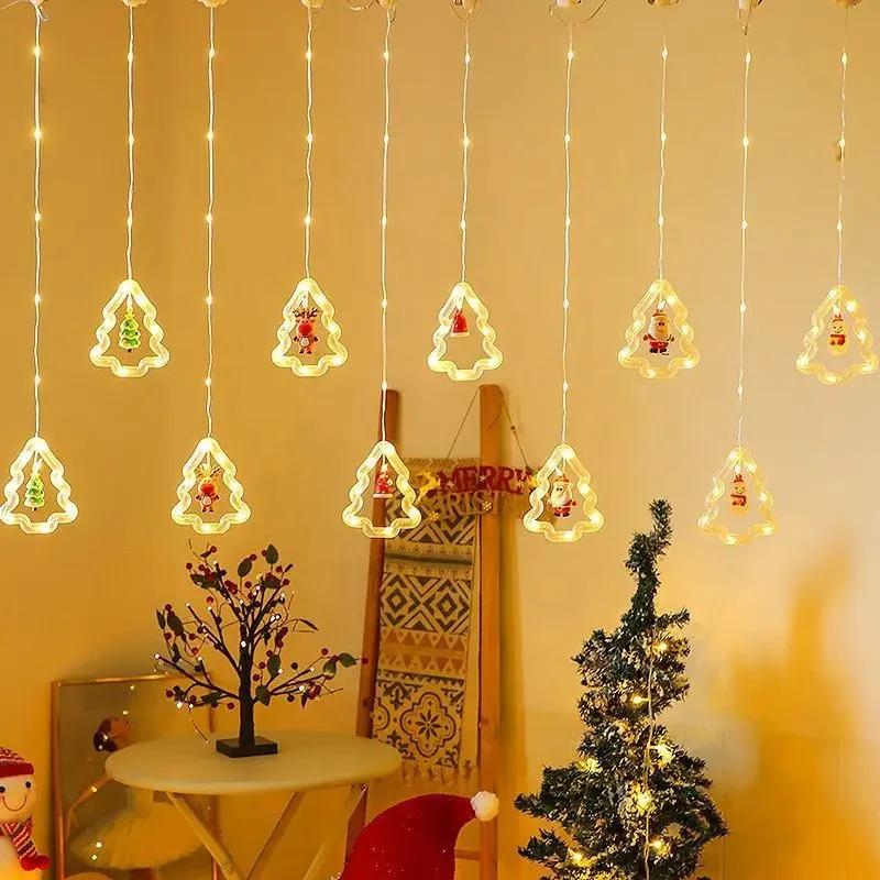 Гирлянда штора "Фигурки в ёлке" 3м (елочка, снеговик, дед мороз, олень, шапка)