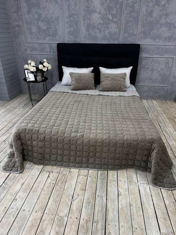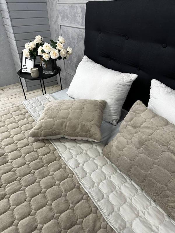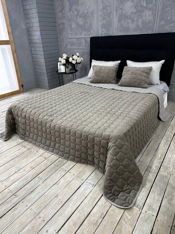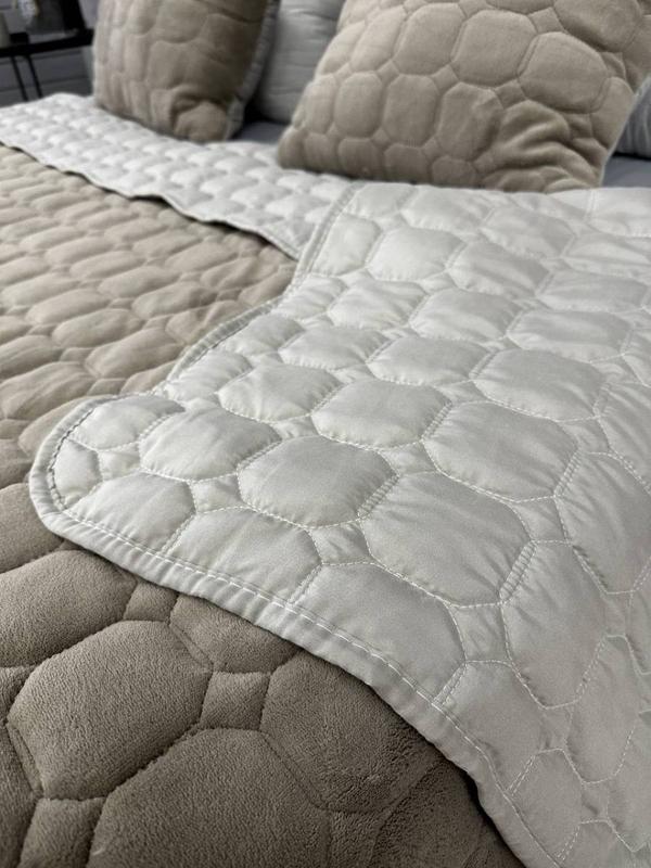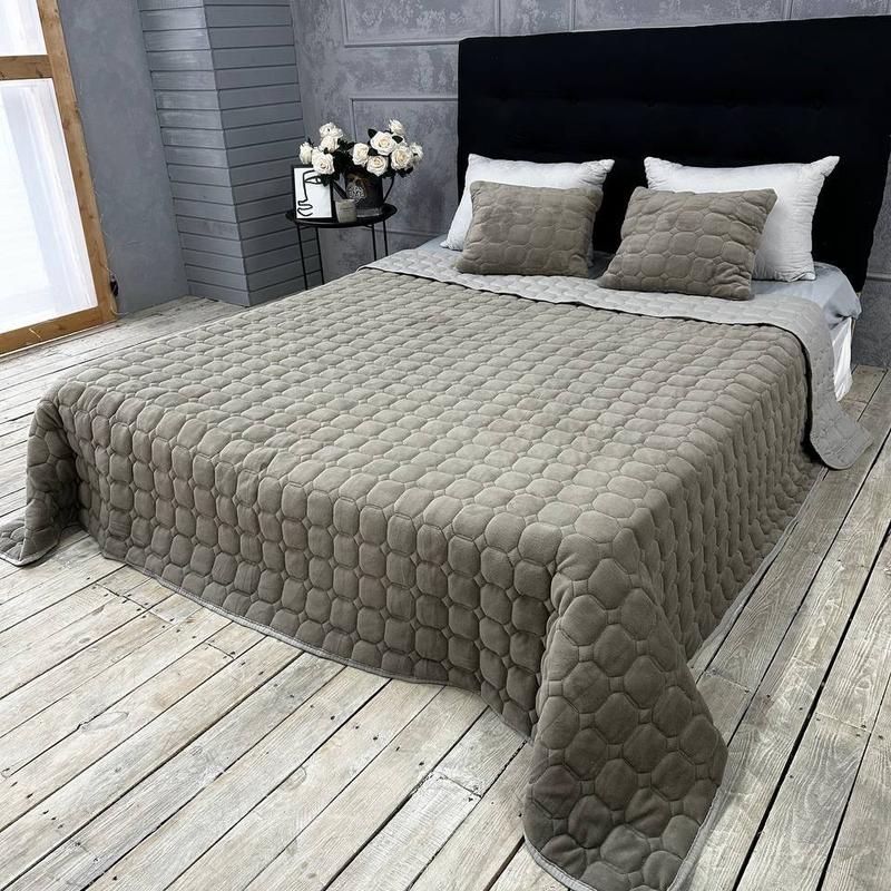 Лицевая сторона покрывала имеет изысканный шелковый блеск и гладкость. Полотно прошивается насквозь стежками, создавая выпуклый узор стеганого покрывала.