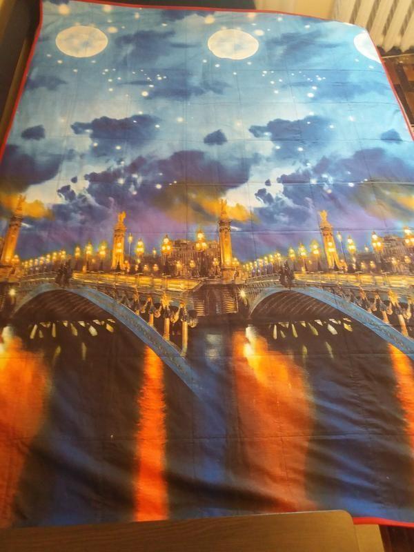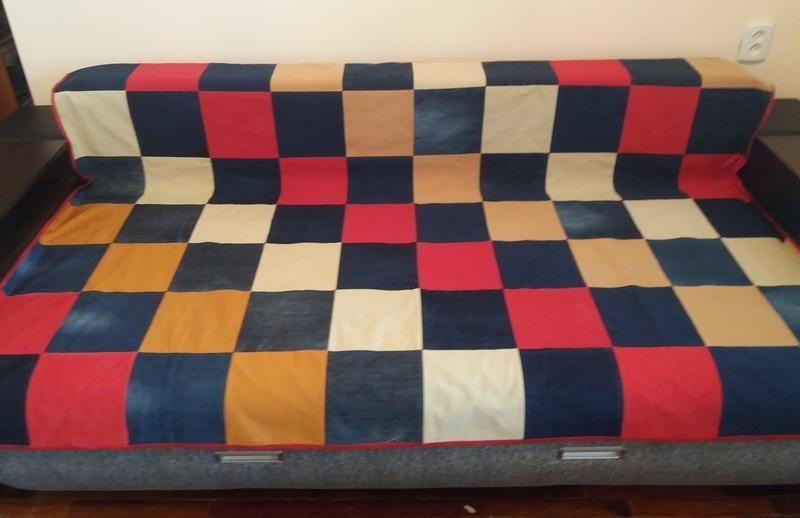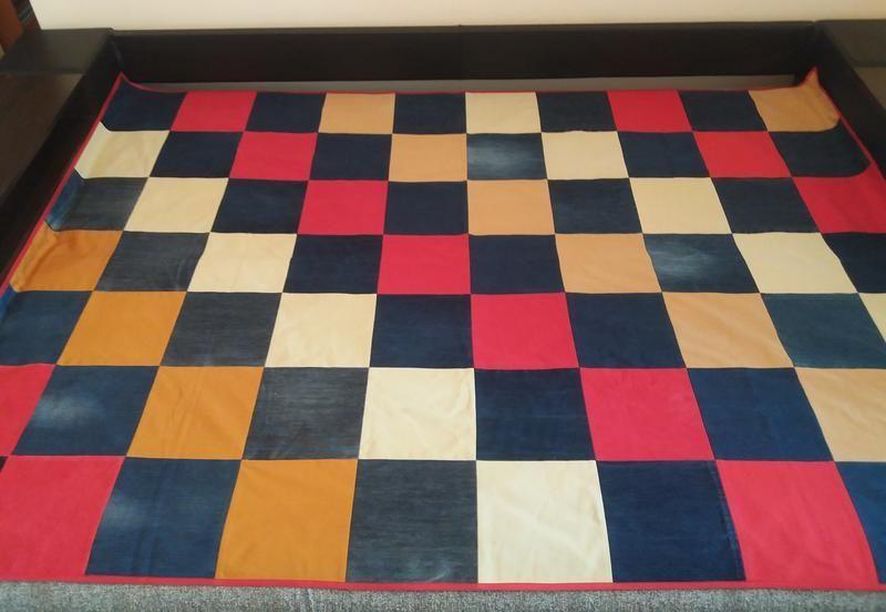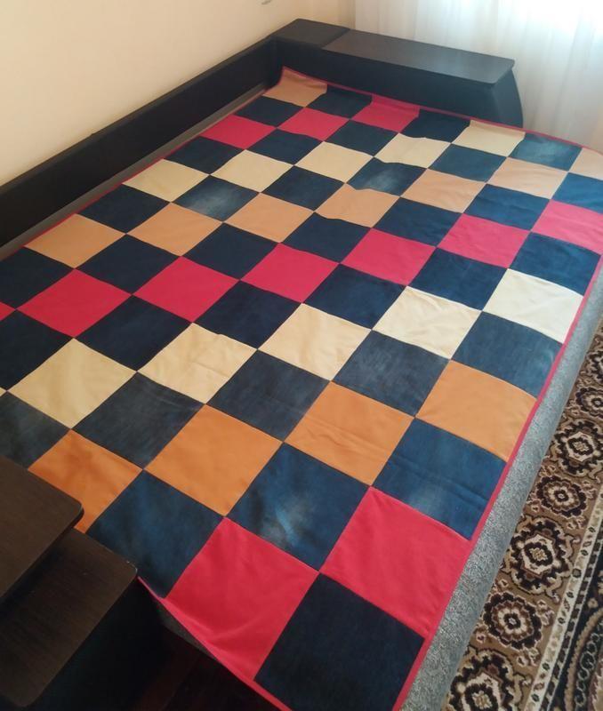 Покрывало выполнено из кусочков джинсовой ткани размером 20 на 20 см. Куски сшиты "швом вовнутрь",закрыты подкладкой (бязью) и простеганы.Края покрывала обработаны красной окантовочной лентой.Размер покрывала 142*202 см.Все ткани прошли влажно-тепловую обработку, "садиться" не будут.