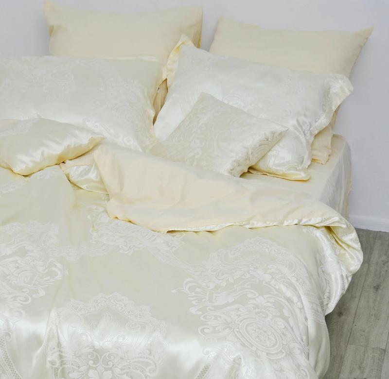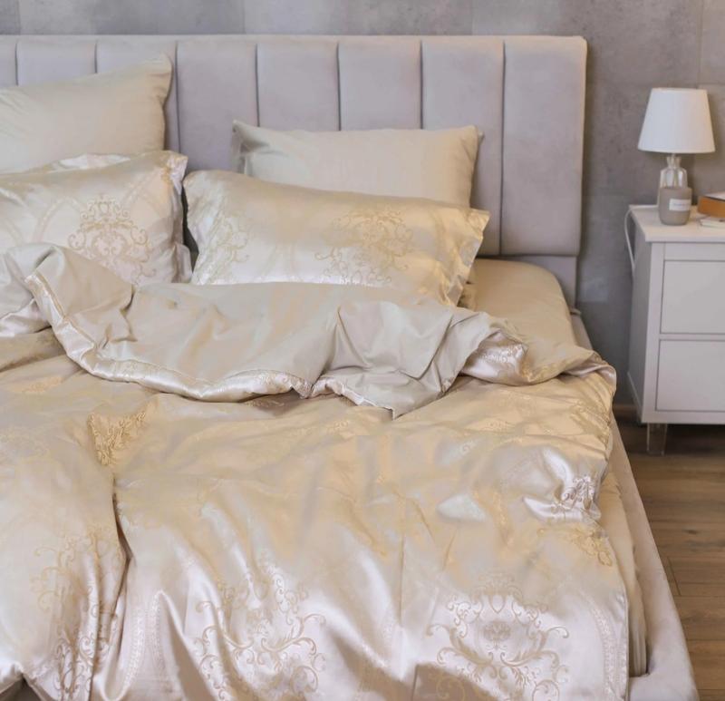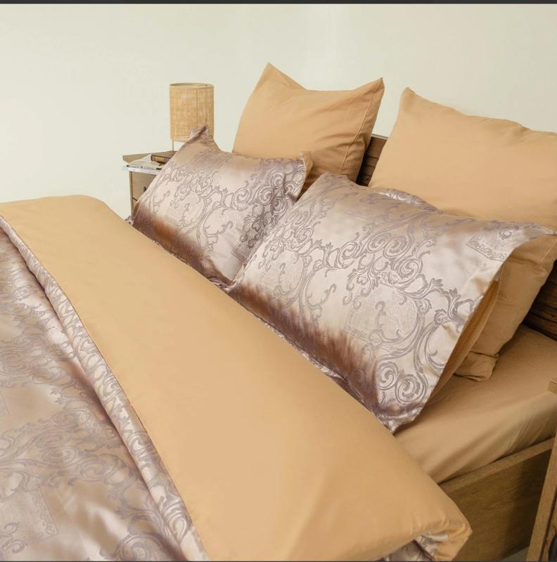 Жаккард — не вид тканини як такої. Це певний і досить специфічний спосіб переплетення ниток. Жаккард-сатин володіє всіма перевагами цього різновиду тканини: висока щільність, міцність і зносостійкість; чудовий естетичний вигляд, багатство фактур, малюнків, кольорів; м'якість і глянсовий блиск; підходить для чутливої шкіри; гігроскопічність, гіпоалергенність; здатність зберігати свою форму, стійкість до зминання; Бавовняні нитки для жаккарда забарвлюються натуральними фарбами, що робить цю тканину ще більш елітарною та шляхетною. Це елітне постільна білизна з високоякісної тканини. Дуже гарний подарунок у дивовижною упаковці, яка ще більше підкреслює статустность!