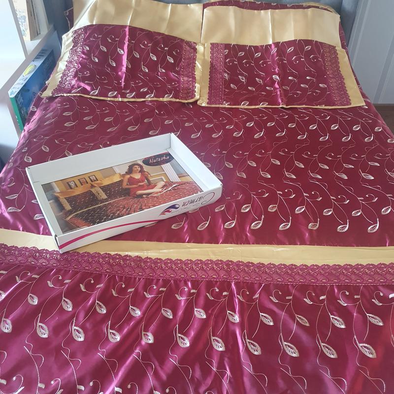 комплект шелкового постельного белья, дву-х сжига, простынь на резинке, в наборе 2 комплекта наволочек 50×70, 70×70, отделан вышивкой и кружевом. Подарите себе сладкие сны))