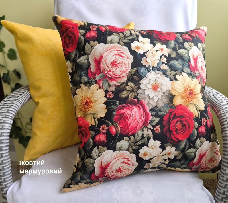 Набор декоративных наволочек 40*40 см красные розы и желтая с мраморным принтом отлично сочетаются между собой по цветам Назначение: для декора интерьера, для садовой мебель на улице, дома на диване размер 40*40 см цена указана за две наволочки 40*40 см в наличии есть несколько наборов! Плотная,декоративная ткань предназначена для декора интерьера! Состав ткани хлопок с полиэстером Наволочки на потайной молнии! Плотность 220г/м2, плотная ткань! Доставка Укр-почтой или Новой почтой