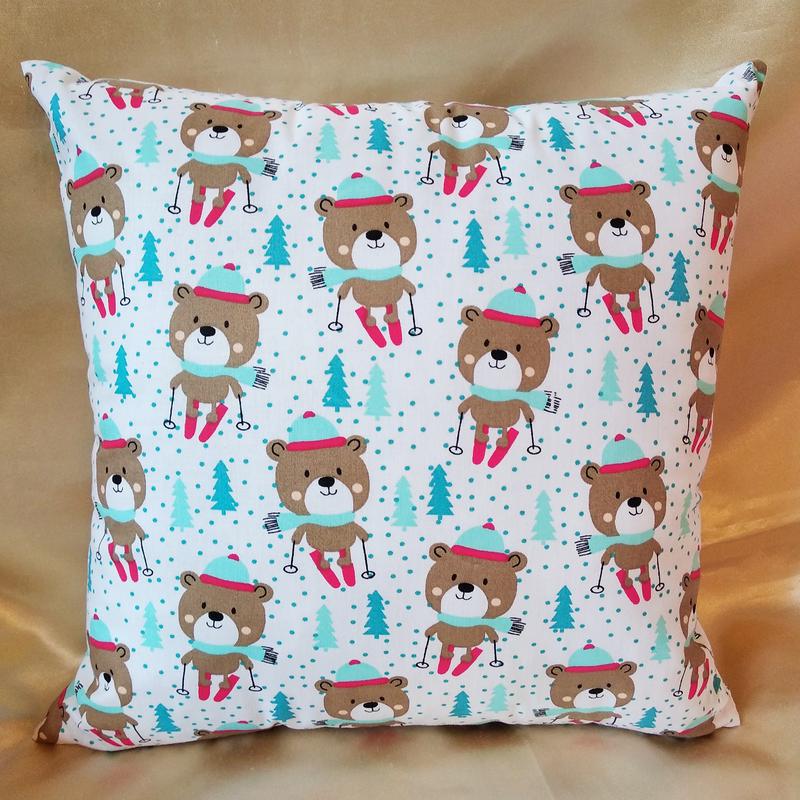 Новогодняя Наволочка с мишками на лыжах на белом фоне
