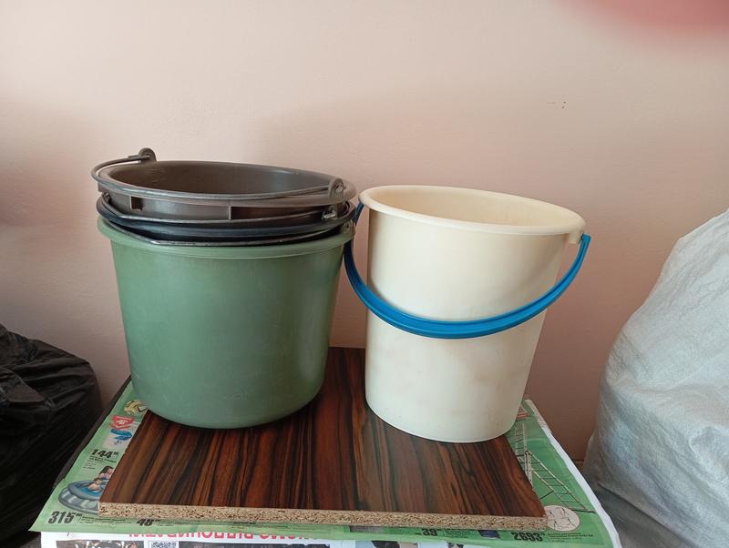 Ведро пластик пищевой,использованные очень мало, в них была только чистая вода, без трещин, цельной.Белое ведро имеет в середине темненькие пятна,воно такое было как купили в магазине