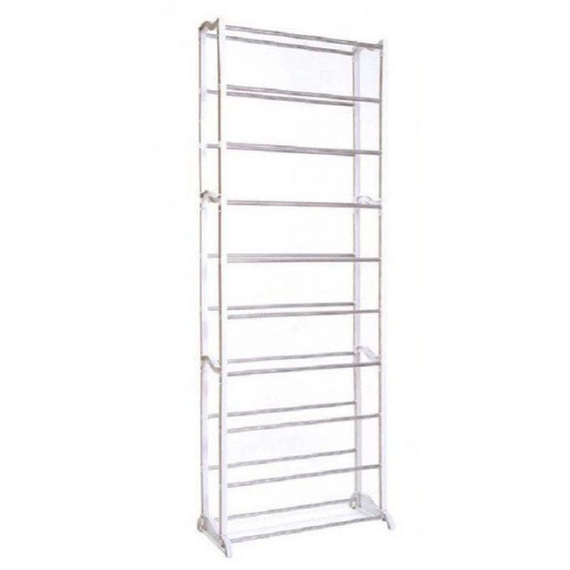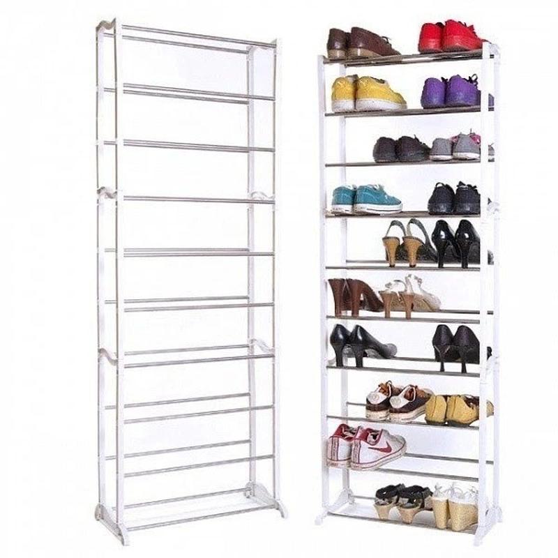 Органайзер-стойка для обуви представляет собой легкую 10-ярусную конструкцию из металлических трубок-перекладин, на которых можно разместить 20-30 пар обуви.