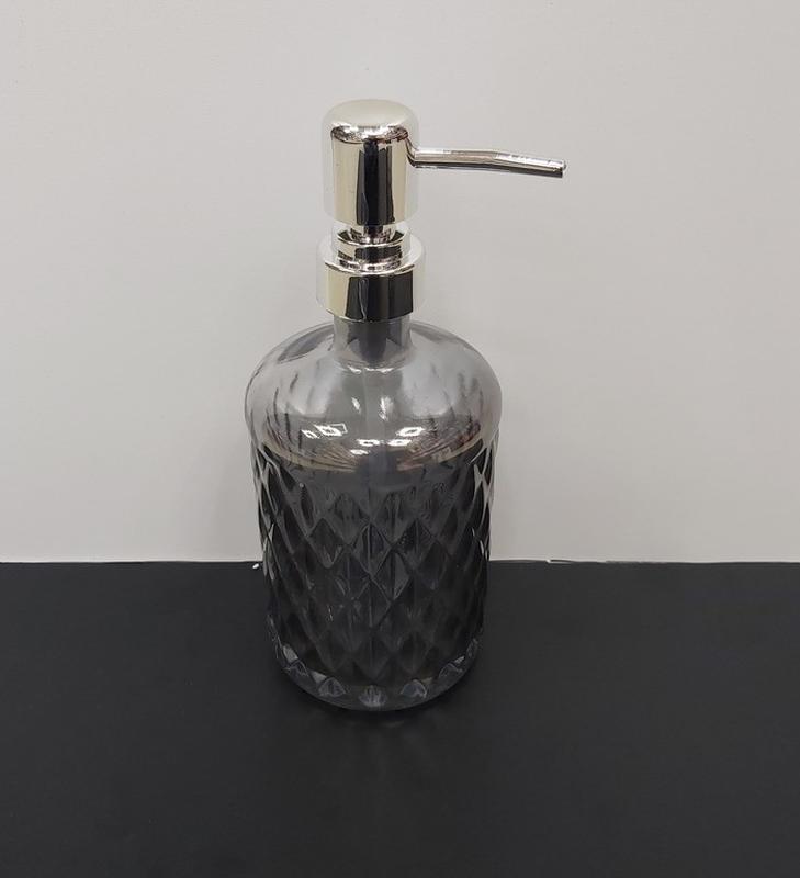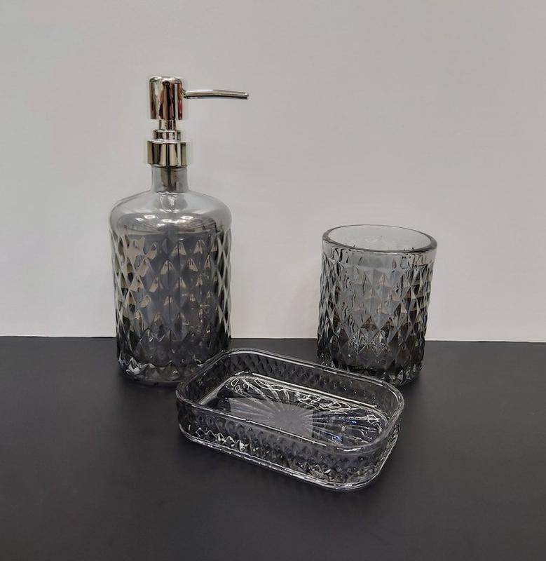 Набор аксессуаров для ванной комнаты стеклянный "Аргайл графит" 3 пр S&T;888-157 Содержит 3 предмета: - стакан 8х8х10см 300мл, - диспенсер для мыла8,3х8,3х20,5см 420мл, - мыльница 12,8х8,3х2,6см.