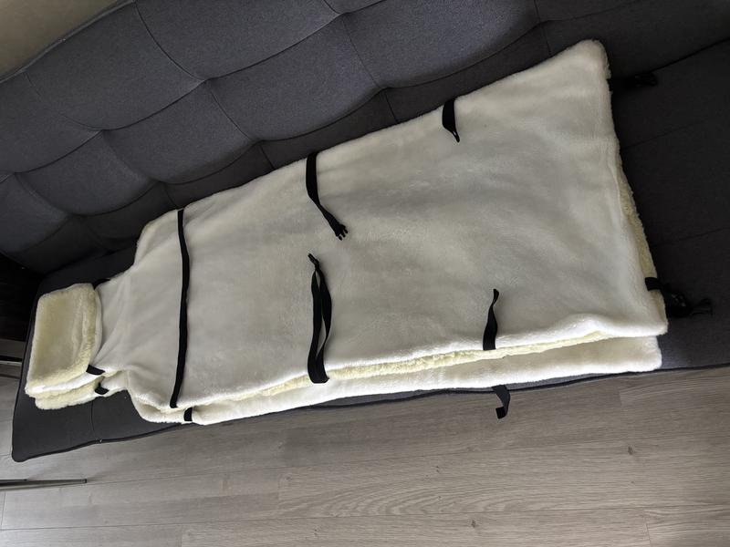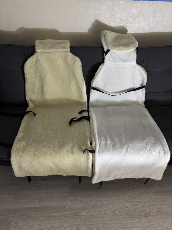 Два белых шерстяных теплых чехла на передние кресла в машину. На голову кресла закрепляется карманом.По длине закрепляется резинками.