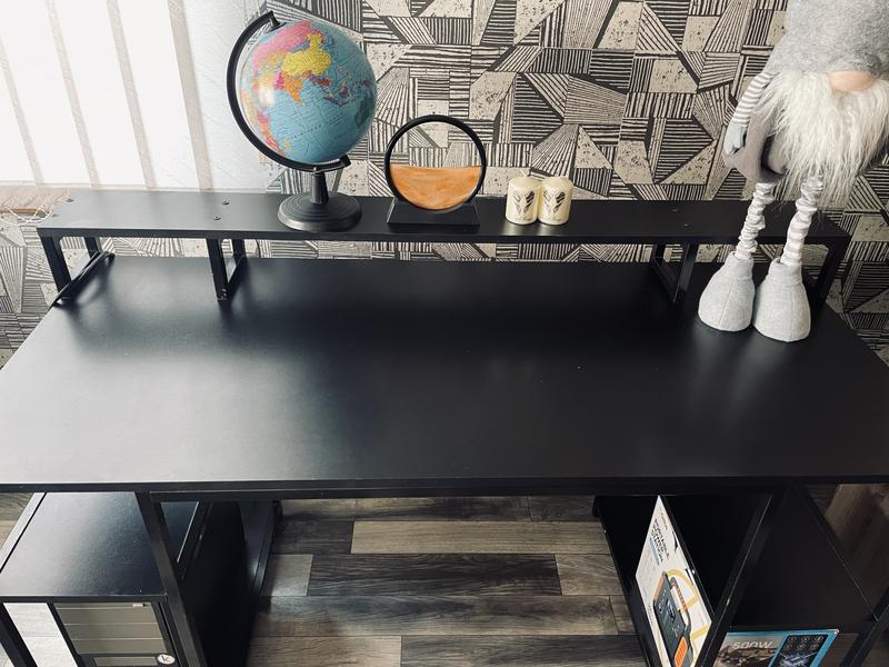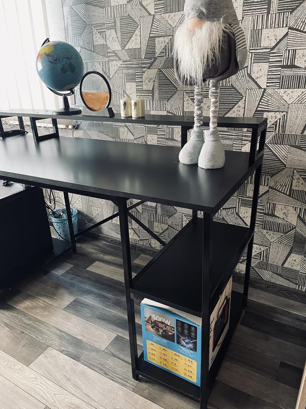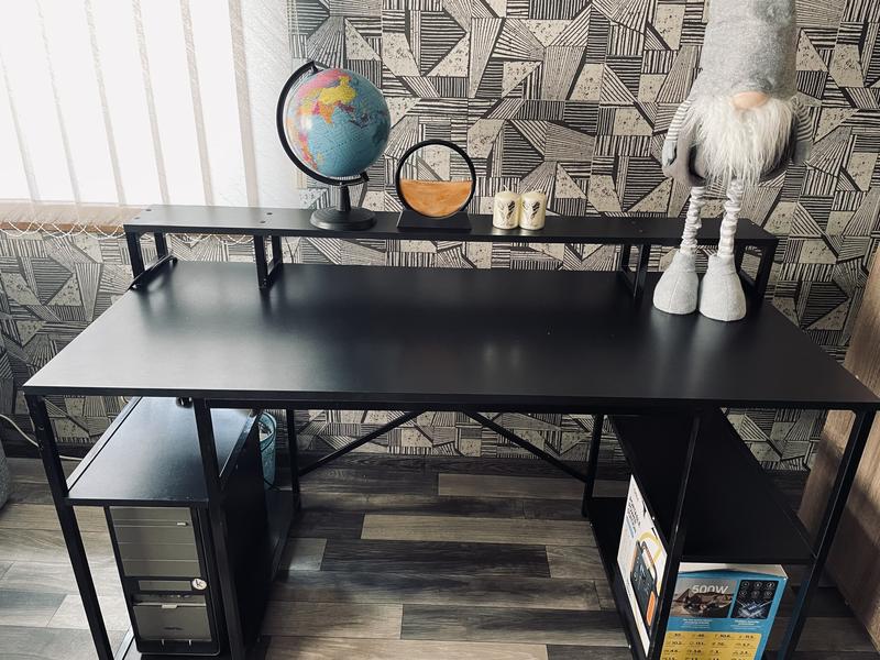 Офисный компьютерный стол Loft Ikea с полками на металлических ножках и деревянной столешницей.