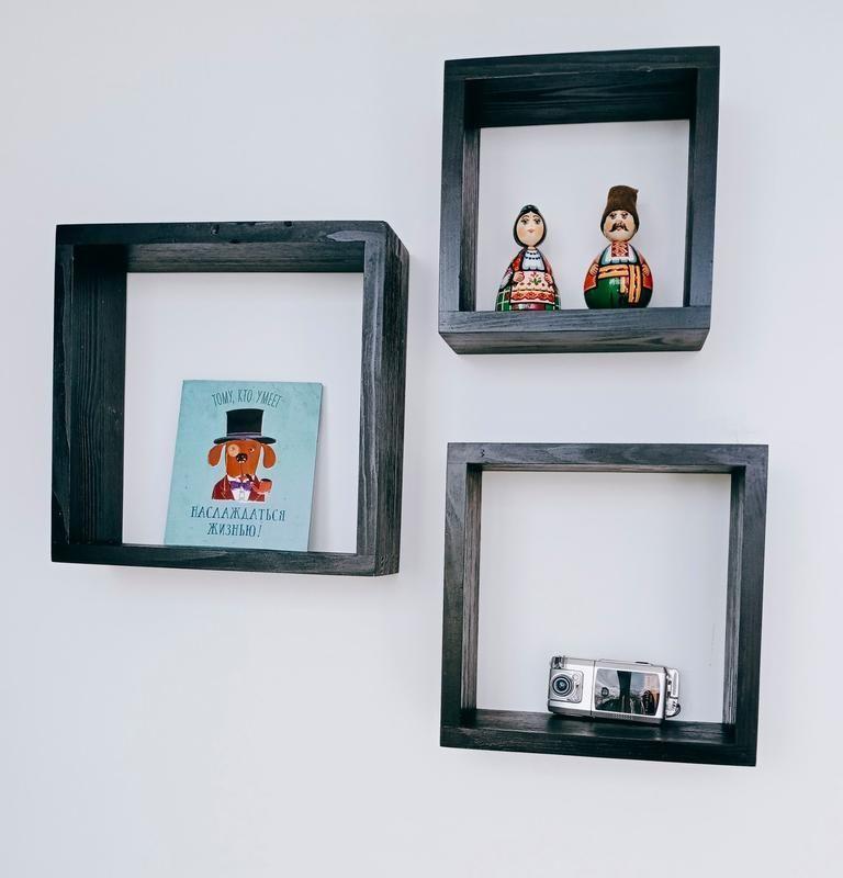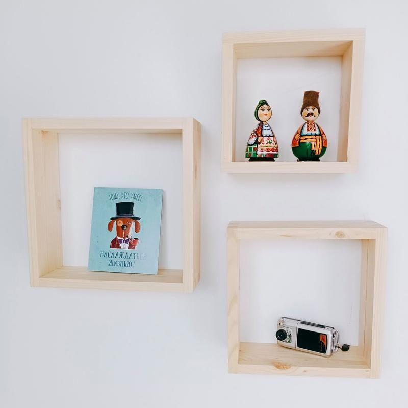 Выполнены из массива сосны. В интерьере смотрятся оригинально и необычно. Размеры полок, мм: 300х300, 260х260, 220х220. Глубина 100 мм.Толщина 2 см.Цена указана без покраски.Если надо покрыть, то обсуждаем.Товар под заказ