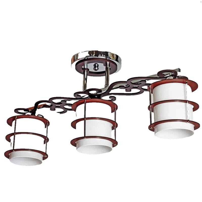 Красиво и необычно выглядит. Корпус изготовлен из металла и хромирован, элементы из пластика под дерево гармонично дополняют. Люстра в сборе длинною 63см., высотою 26см., шириною 14см. Плафоны большие из стекла, внутренний плафон высотою 12см., в диаметре 10см. Патроны стандарт е27 (большие). Крепится к потолку на планку, диаметр тарелки: 15см.