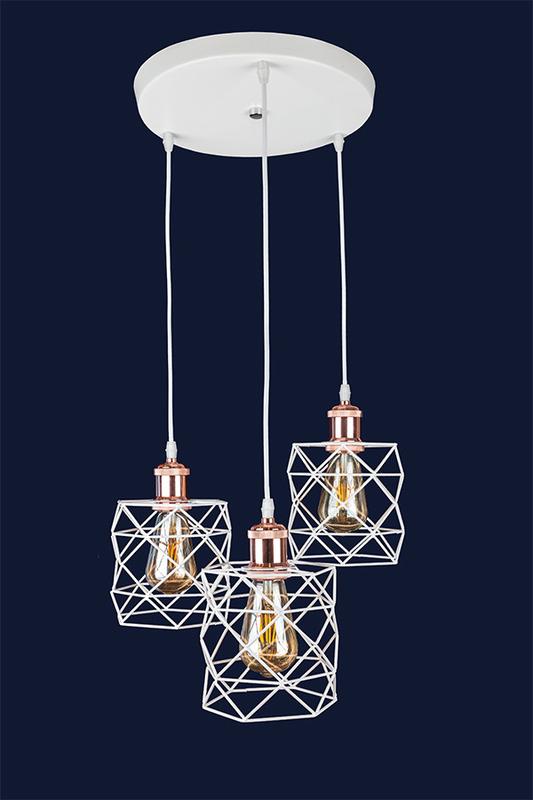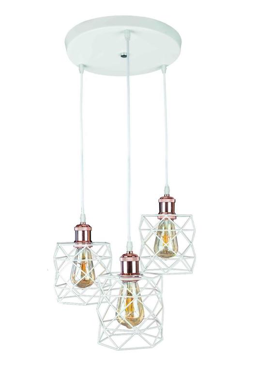 Стиль: Лофт; Ширина: 150 мм; Высота: 155 мм; Тип патрона: E27; Цвет: Белый,медный; Количество источников света: 3; Максимальная мощность ламп: 60W;Напряжение ламп: 220V;
