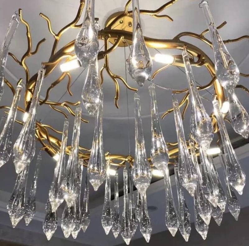 Фантастика чи природність? Унікальне поєднання золотого металевого корпусу у вигляді переплетених гілок, з яких застиглими краплями звисають скляні підвіси Люстра є в двох розмірах 60 та 80 см діаметром