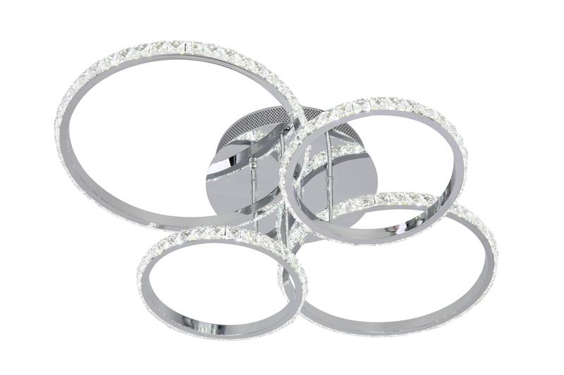 Люстра имеет четыре плафона в виде колец хромового цвета, изготовленные из