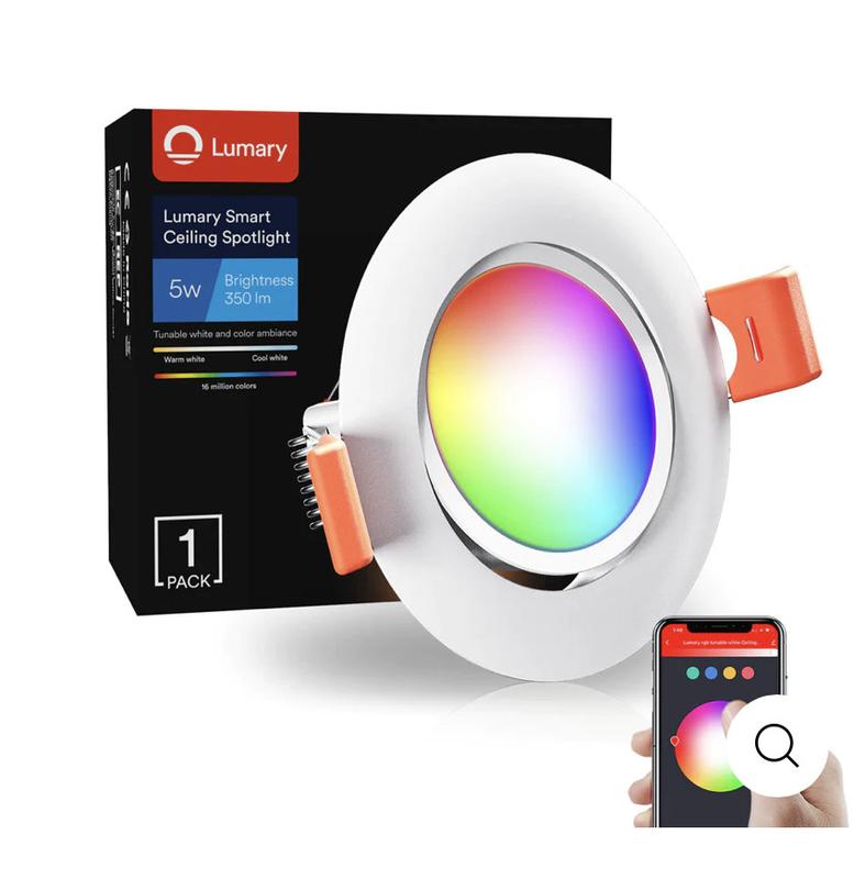 Встраиваемые потолочные светильники Lumary 5W WIFI Smart LED (1 упаковка) Интеллектуальные встраиваемые потолочные светильники Lumary со светодиодной RGB-подсветкой позволяют полностью контролировать и изменять яркость, цвета или даже угол прожектора с помощью приложения «Lumary» (2,4 ГГц Wi-Fi). Настраивается между мягким белым и дневным белым (2700-5000 Кельвинов). Освободите руки для голосового управления с помощью Amazon Alexa и Google Home Assistance. Разрешение различных настроек, которые будут скорректированы по вашему желанию.