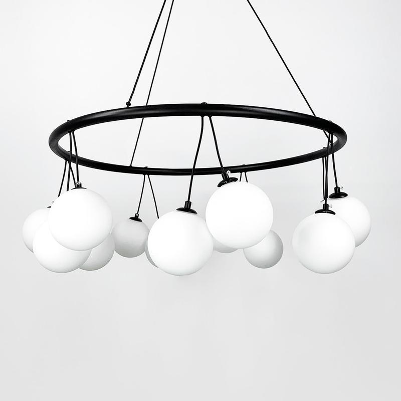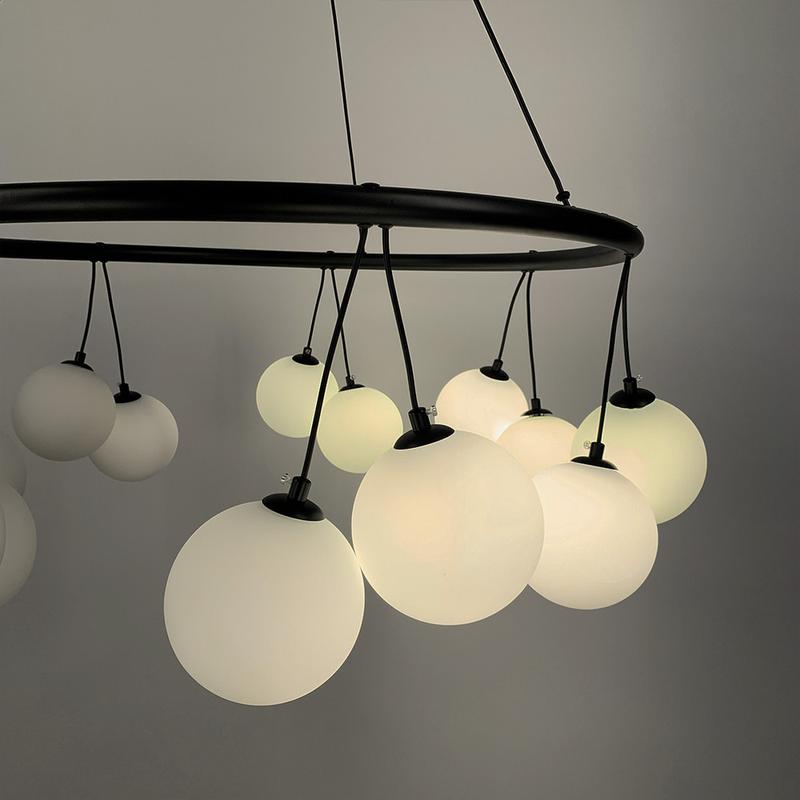 Люстра-кільце у двох діаметрах в корпусі чорного кольору з підвісними білимиплафонами. Висота люстри регулюється. В комплекті є лампочки потужністю 3 Вт.Діаметр 60 см - 10 плафонів Діаметр 80 см - 14 плафонів