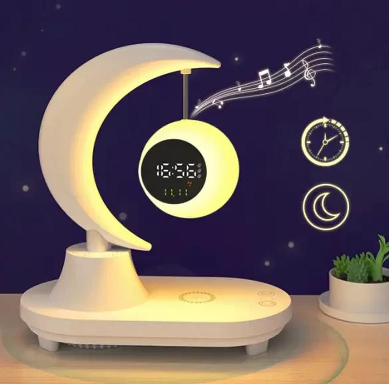 Ночник с беспроводной зарядкой и Bluetooth колонкой Луна с часами, настольная