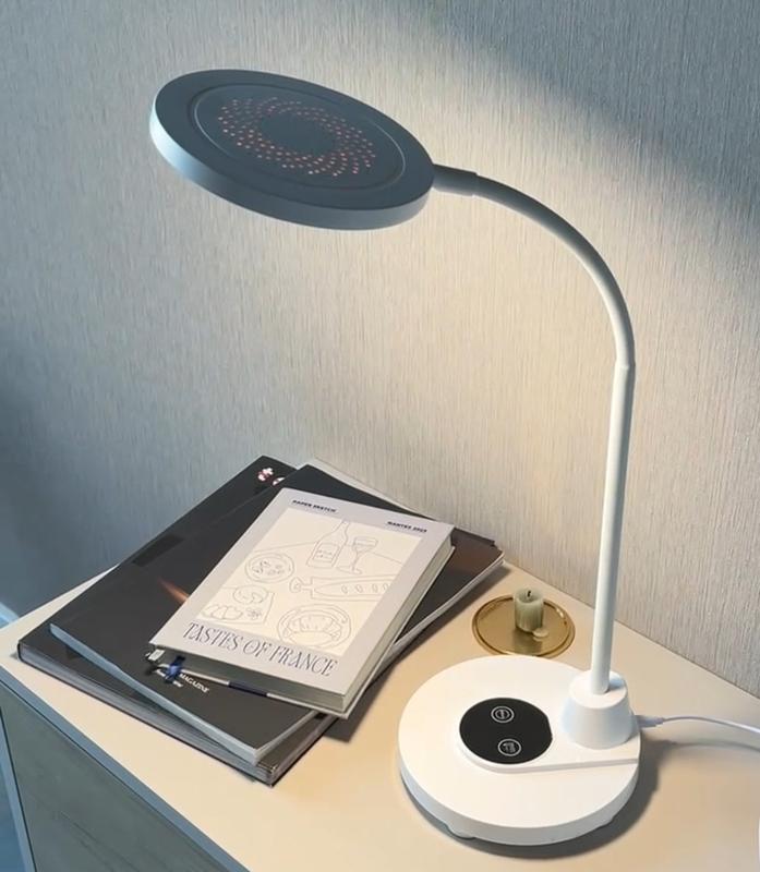 Настольная лампа имеет круглое основание с сенсорной панелью для включения и выключения лампы и регулировки яркости. Лампа оснащена гибкой ножкой, позволяющей регулировать направление света.Лампа оснащена энергосберегающими светодиодами, создающими яркий и равномерный свет. Она поддерживает три режима освещения: белый, теплый и желтый, что позволяет подобрать оптимальное освещение, хорошо подходящее для работы или чтения. Лампа может служить ведущей зарядкой. - Питание - от сети - Материал корпуса - пластик - Мощность - 5W - Размер - 16х16х40см
