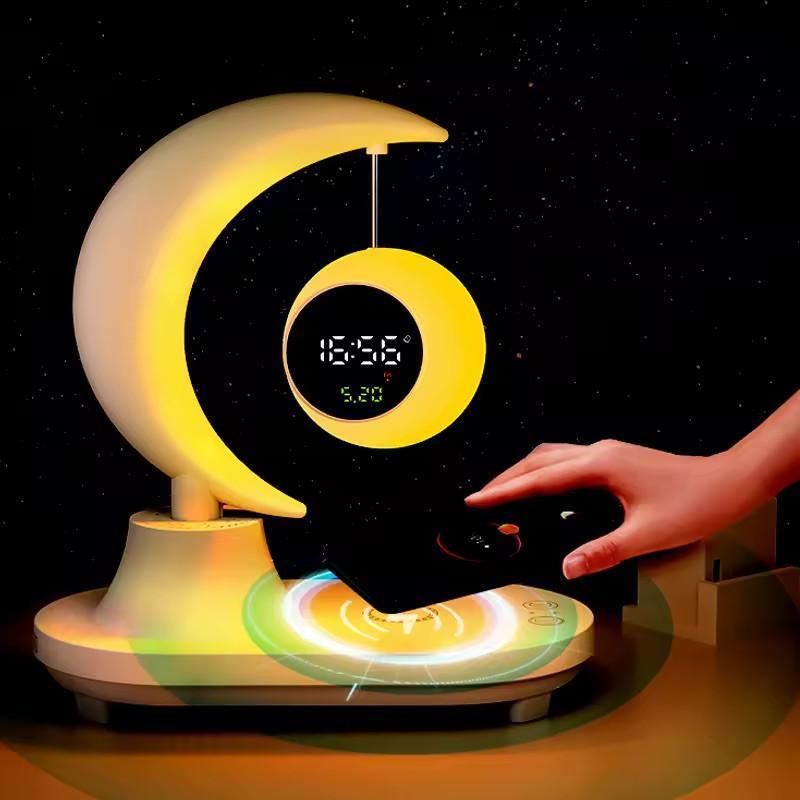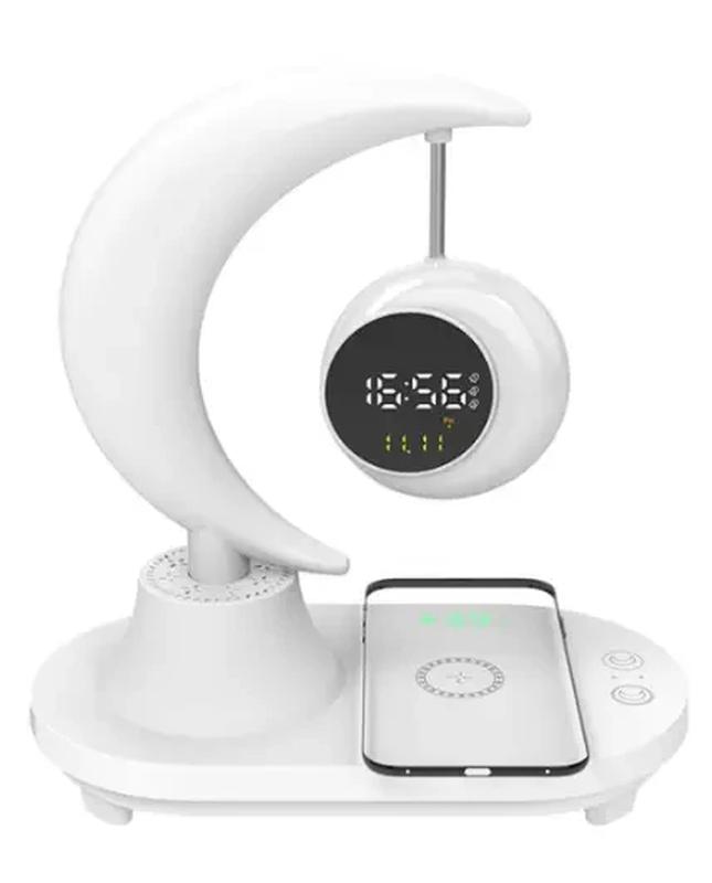 Ночник с беспроводной зарядкой и Bluetooth колонкой Луна с часами, настольная