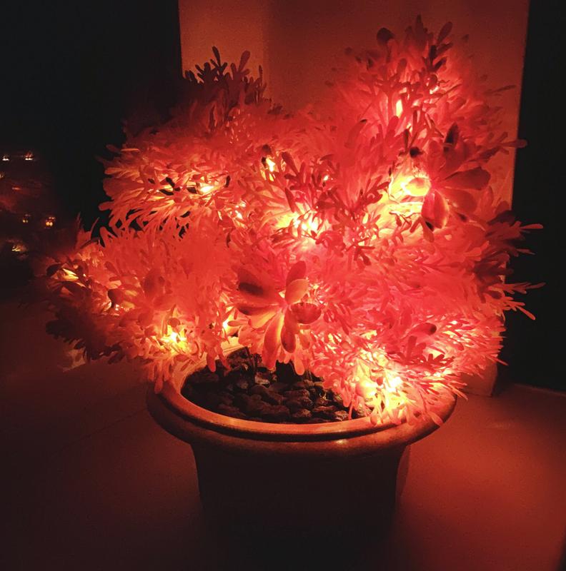 Светильник работает от LED-света, коробка для батареек скрыта в цветочном горшке, для того чтобы включить/выключить ночник (или поменять батарейки) необходимо снять верхнюю крышку (как на последнем фото)