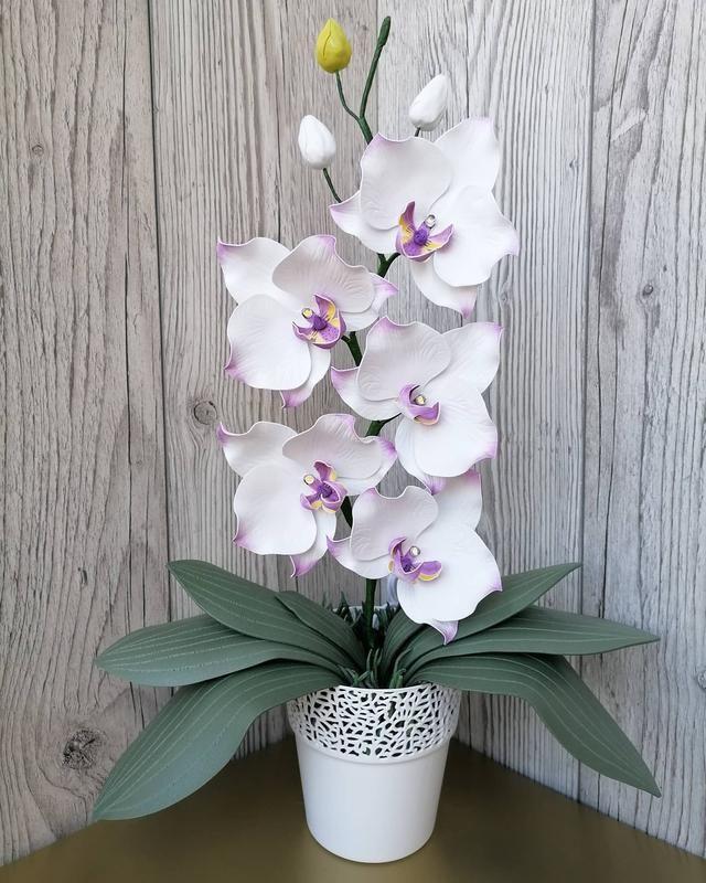 Светильник настольный орхидея. Ручная работа. Материал : фоамиран, изолон. В композиции 5 цветочков 11 * 9 см, в каждом цветочке светодиод ( светодиоды сменные). Высота 50см.; ширина 30 см. Шнур длиной 1 м . Адаптер в комплект не входит, если нужен то + 45 грн. Работает от сети 220 В. Возможет повтор в разных расцветках, высотой от 30 см +, любым количеством веточек и светодиодов ( цена варьируется).