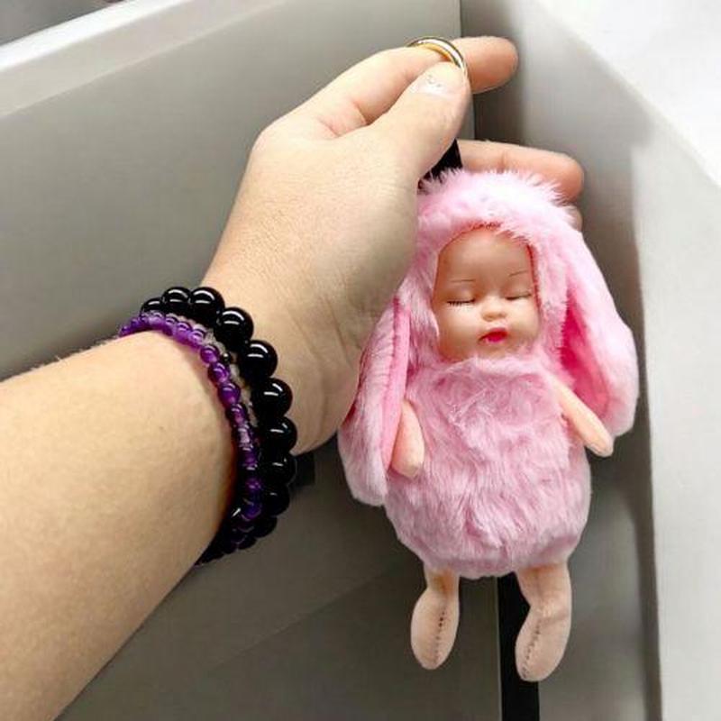 сплячого пупсика в костюмчику кролика. Брелок має надійний тип кріплення: