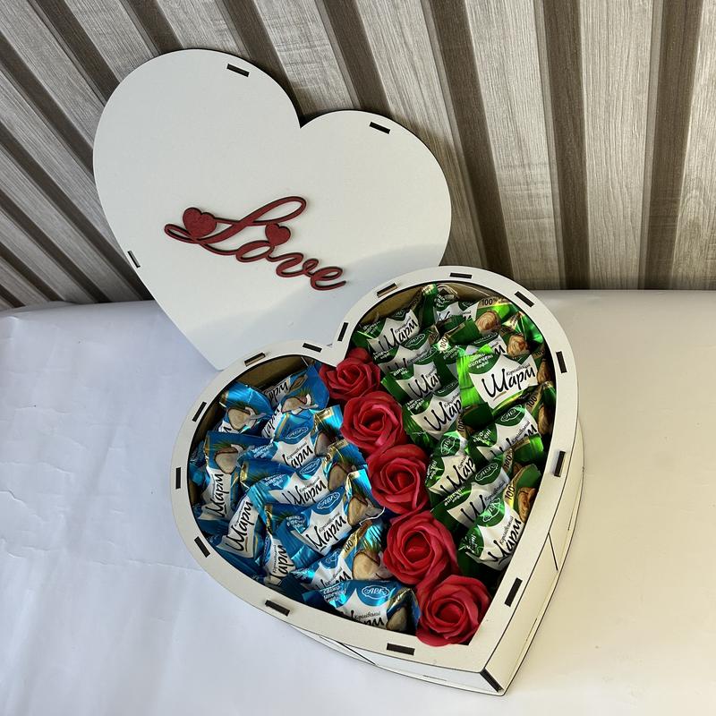 Подарочный бокс в деревянной коробке в форме сердца с мыльными розами и сладостями kinder