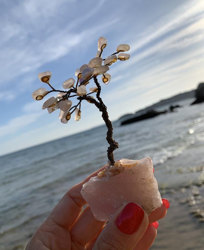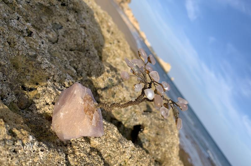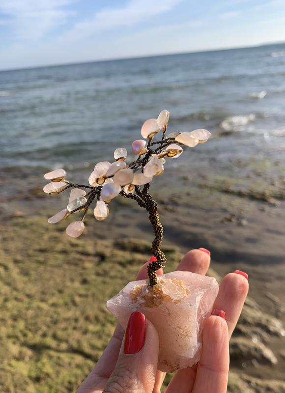Сувенир ручной работы в виде Дерева жизни, бонсай из натурального жемчуга и розового кварца и проволоки. Общая высота 10,5 см, камень у основания 5х5х3 см. Небольшое нежное деревце украсит интерьер и может стать вашим талисманом.