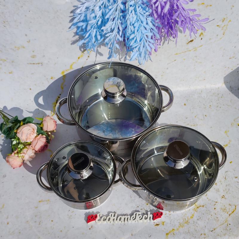 Состоящий из 6 предметов, набор включает в себя кастрюли с крышками разного