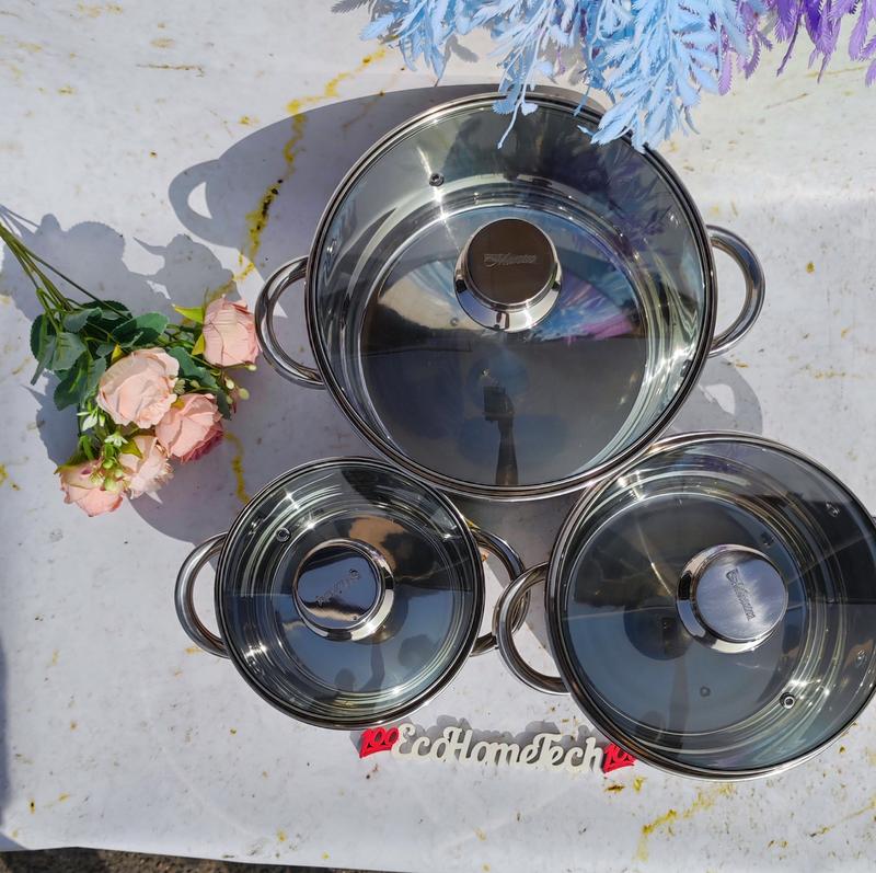 Состоящий из 6 предметов, набор включает в себя кастрюли с крышками разного