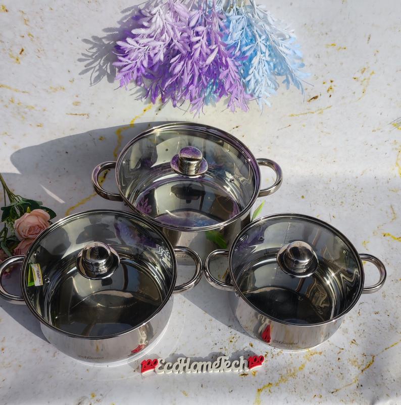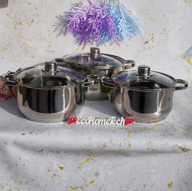 Состоящий из 6 предметов, набор включает в себя кастрюли с крышками разного