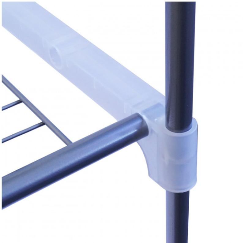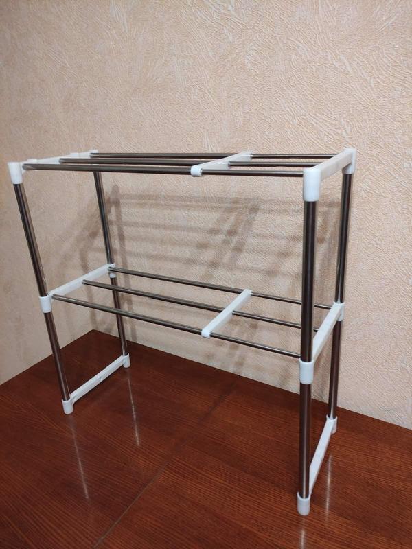 Каркас стеллажа и полки выполнены из нержавеющей стали. Крепления сделаны из толстого пластика, что обеспечивает устойчивость и надежность конструкции. Стеллаж не шатается и не вибрирует при работе микроволновки. Позволяет значительно сэкономить место и организовать хранение кухонных принадлежностей.