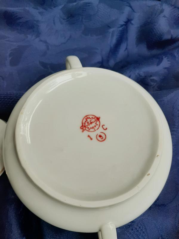 Изделие маркировано, на донной части надглазурное клеймо, характерно для 1957-1970 годов, нанесено красной эмалью (1 сорт).