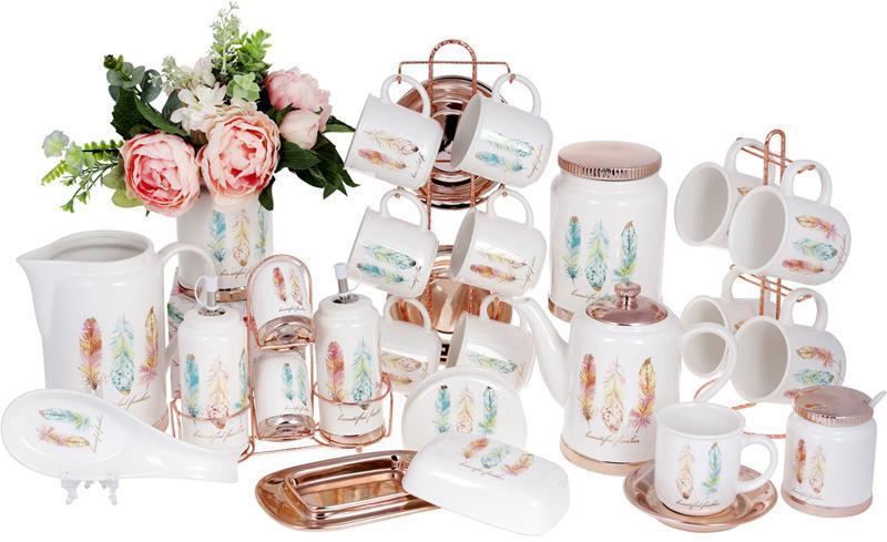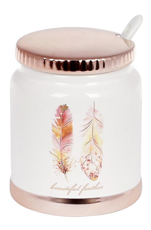 Цукорниця Плюмаж "Перо жар-птиці", банка для сипучих продуктів. Об'єм 300мл.Біла кераміка з декором - кольорові пір'я Жар-птиці. Золотиста кришка. Розмір:8х12.8х8.5см. Запакована в подарункову коробку.