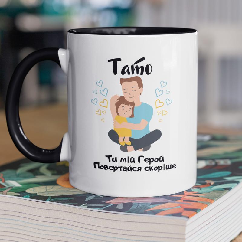 Чашка керамічна з принтом "тато ти мій герой" 330 мл, біла з чорною ручкою